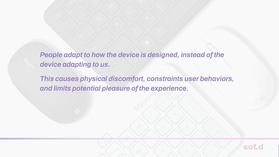 People adapt to how the device is designed, instead of the device adapting to us. This causes physical discomfort, constraints user behaviors, and limits potential pleasure of the experience.