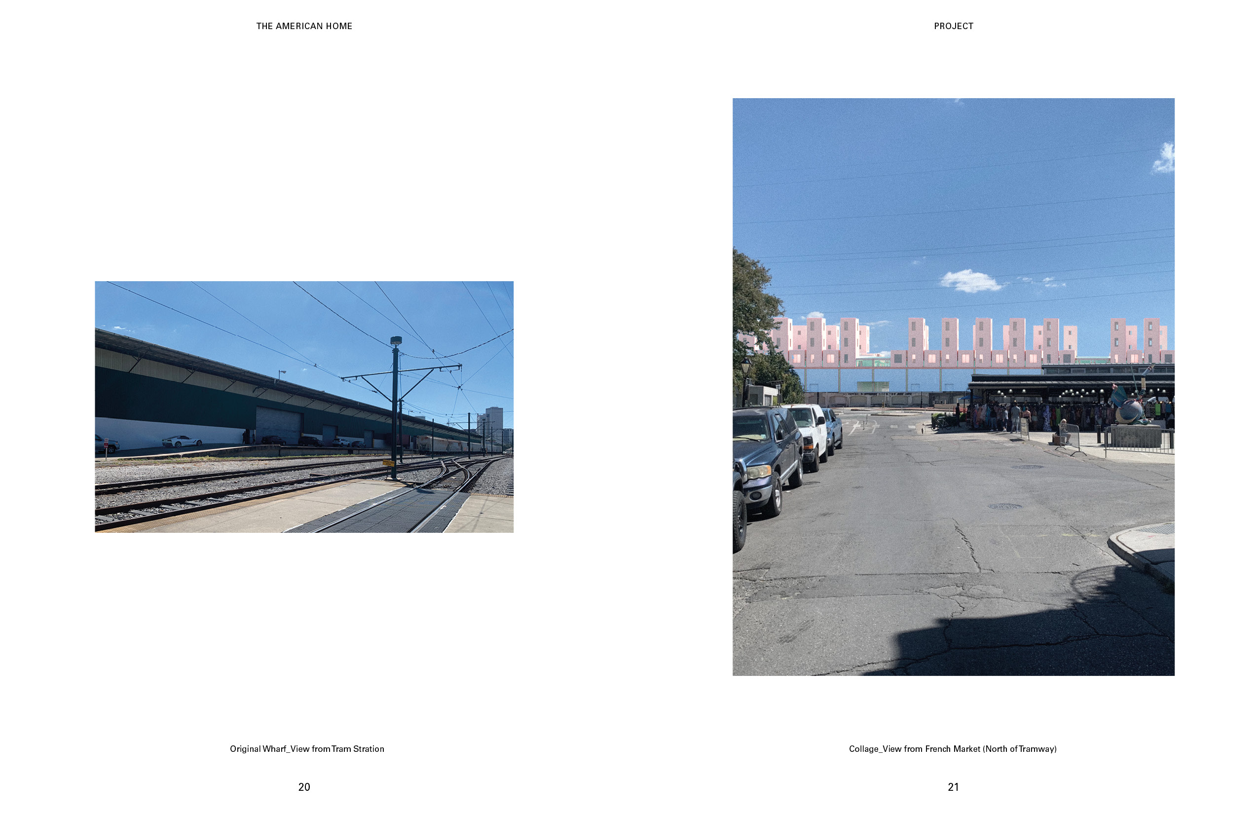 The original motive behind this fusion was people’s ever-growing need for faster parcel delivery. Next day, two hour, even one-hour delivery! Corporates like amazon are spending a huge number of resources on building warehouses across the world, trying to improve the speed of the last-mile delivery. In response to that, I would argue, if all that we need can and will be delivered to us, it would make a lot of sense to just create a new type of urban infrastructure that houses both people and the people’s goods at the same time. Therefore, warehousing. Warehousing is a new housing type that combines the logistic infrastructure, the warehouses and the distribution centers, with the short-term rental housing. The residents would not only digitally but also physically subscribe to the ubiquitous logistics network and the services it provides. The neighborhood then is not just what is within a mile of the apartment, but the whole world. Warehousing could also be a method to transform existing obsolete warehouses in the urban context. Within the scope of this studio, this example of warehousing in New Orleans is an adaptive-reuse of the Governor Nicholls Wharf, which is planned to be demolished in two years. It sits on the river bank of the Mississippi river to the Southeast of the famous French Quater. It is also right next to the end of the city tramway, the French Market station. With the French Market at the North, the site is sandwiched between the tramway and the river, the two most significant transportation infrastructures in the city.