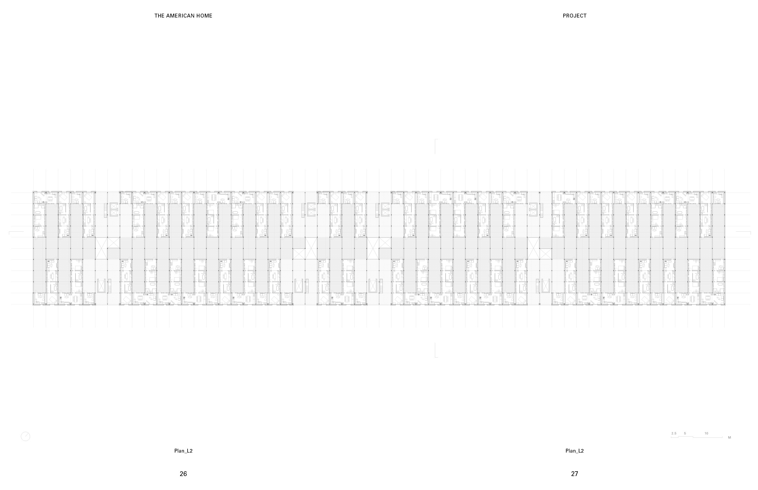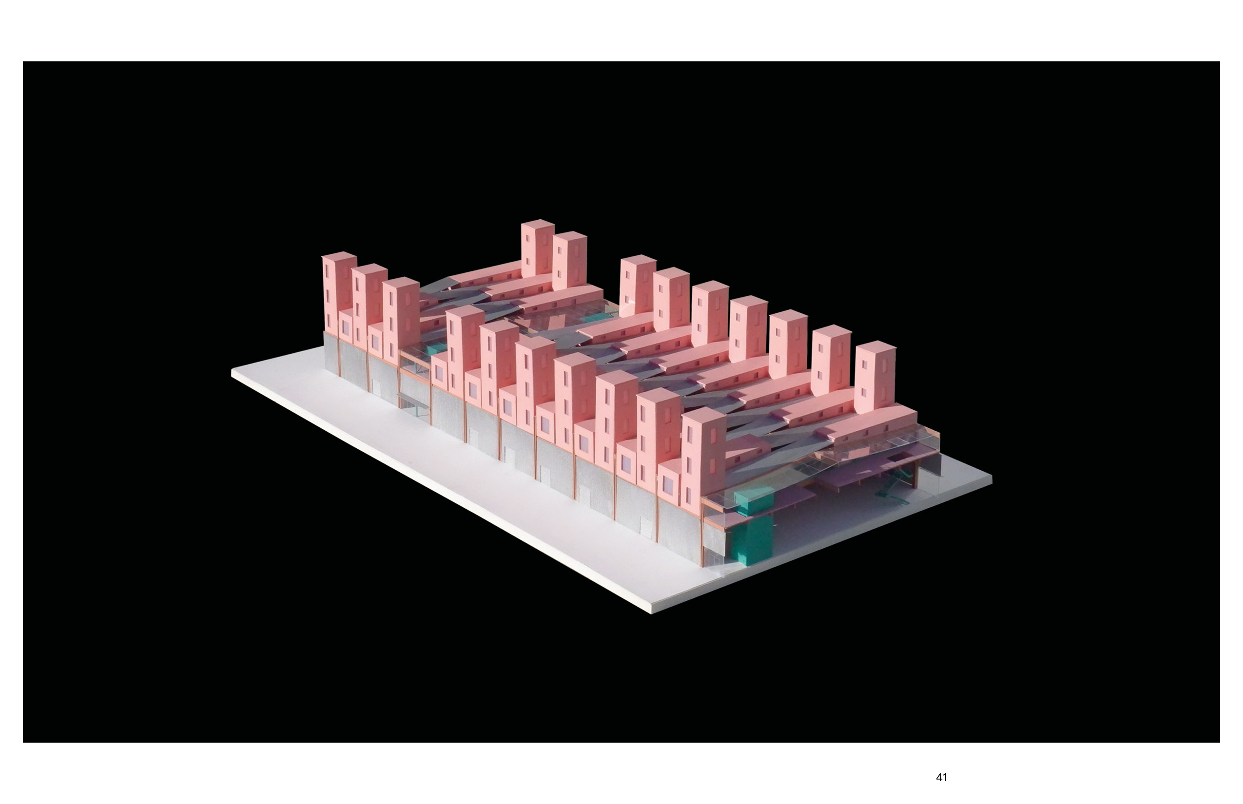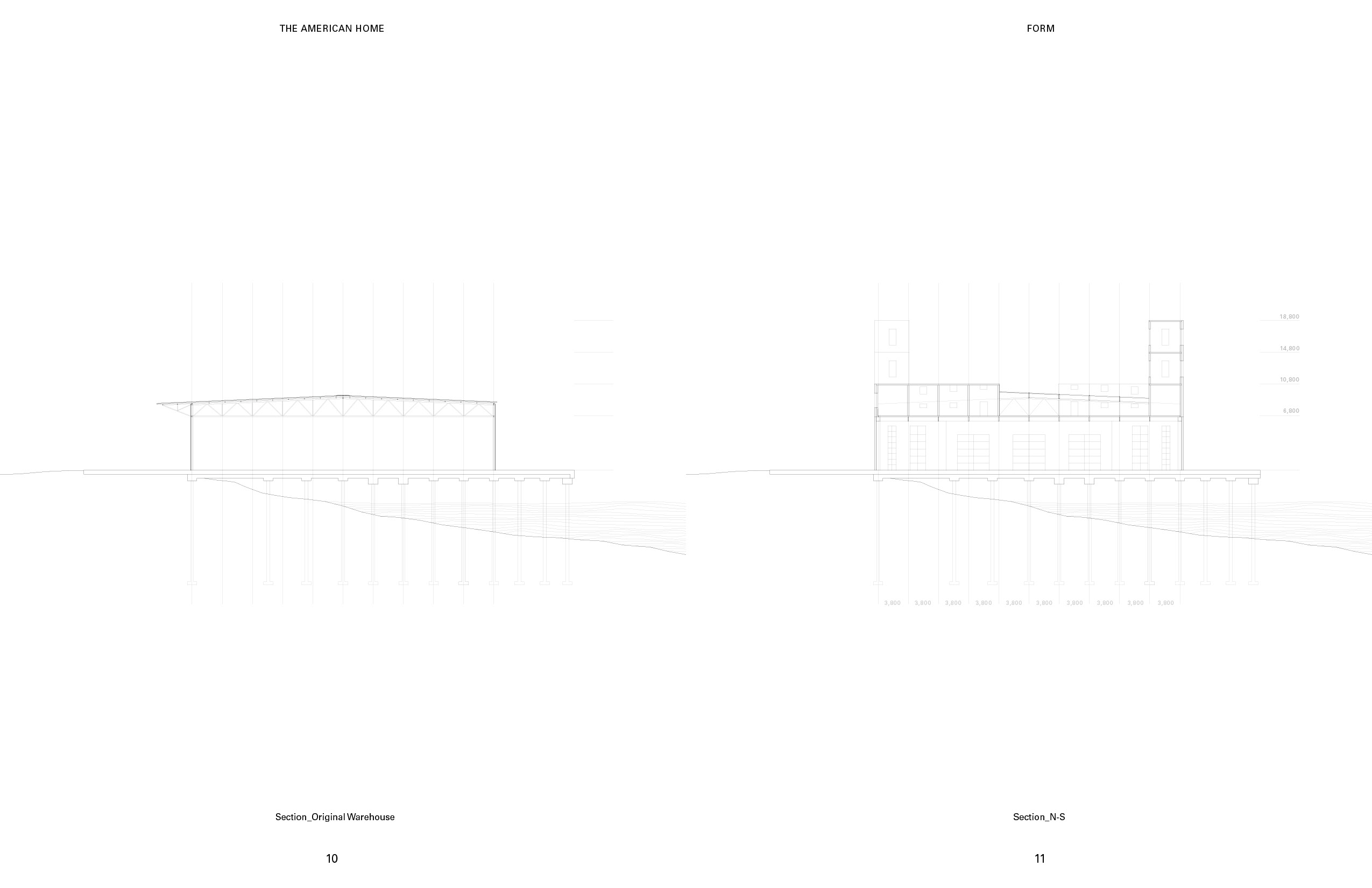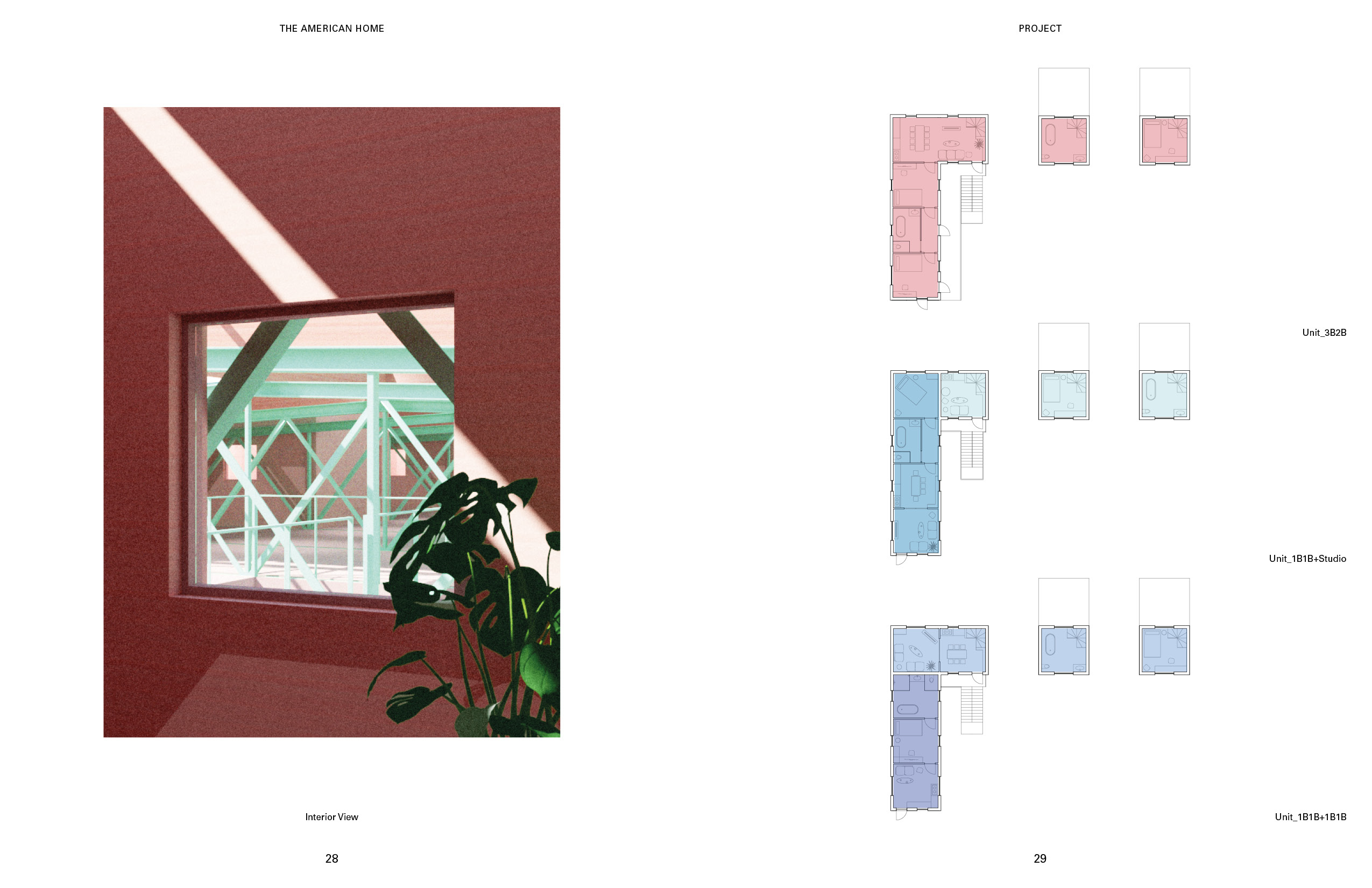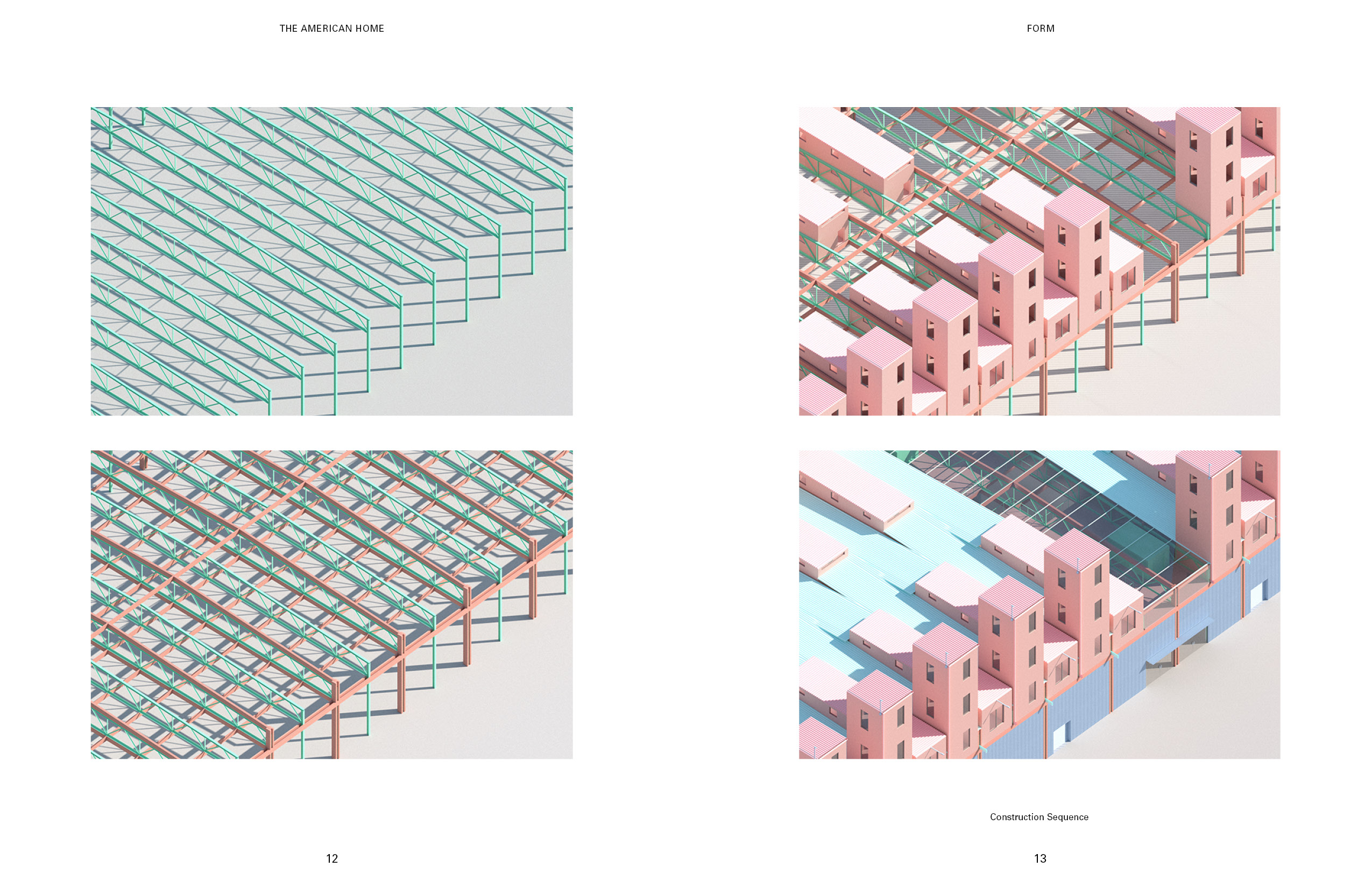 Furnishing and un-funishing the place have always been a problem for both the tenants and the property management. For the tenants, it takes so much money and time. For the management, the furniture from the old tenants often become large waste item hard to get rid of. On the left is a rendering of the warehousing I proposed as a solution to this problem. The pink towers and houses at the top are the residential units. The bottom level is the furniture storage and exhibition center. The program at the bottom provides the space and the infrastructure for storing the used furniture from the tenants that are moving out. After the new tenants signed the leasing contract, they can start furnishing the unit using the second-hand furniture from the furniture storage at the bottom. This combination of the programs could introduce a new system that is essential for promoting circular economy and avoiding single-use furniture, which could generate massive amount of waste. For the construction sequence of the transformation, the first step is to dismantle the envelope. After that, reinforcements would be added to every other truss to introduce a platform that sits at the bottom edge of the truss. Then prefabricated housing units would then be placed onto this platform. At the meantime, the corrugated steel sheets from the original warehouse would be repainted. The final step is to reinstall the repainted steel sheets back to the new mixed-use building. This system has to come from my observation of the relationship between the ultra efficiency-oriented plan of the distribution facilities, and the order of the housing types from the pamphlet, the shotgun house and the “father-son-holy ghost” house. The existing order of the wharf structure could be a nice site for potential re-exploration of some of the historic architecture typology from New Orleans. The plan and section of the shotgun house represents a clear construction logic and idea that used to be widely adopted in the area. I think these types have a lot of potential in the field of prefabrication. Therefore, in this project, I would like to propose adding an array of prefabricated housing units similar to the shotgun type on the top. Through overlapping the group of types with the exisitng efficient structural grid, I intend to create a new prototype for repurposing existing warehouse into mixed-use housing. The ground level of the warehousing is divided into four parts based on the flow of the cargos in distribution facilities. These sections are for cargo reception, sorting, compact storage, and distribution. The roof and the envelope of the transitional area between sections are made of glass panels, allowing natural light to shed inside. This area is also where the elevators to the upper level are located. The lifts for the tenants are located to the north, close to the tramway and the French market. The cargo lifts, on the other side, are along the south edge, close to the river. The new furniture and packages that arrives from the river can be moved upstairs to the housing level directly using the cargo lifts without interfering with the logistics of the storage or the tenants.